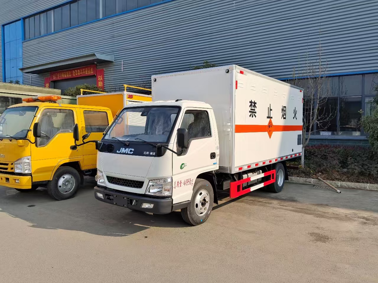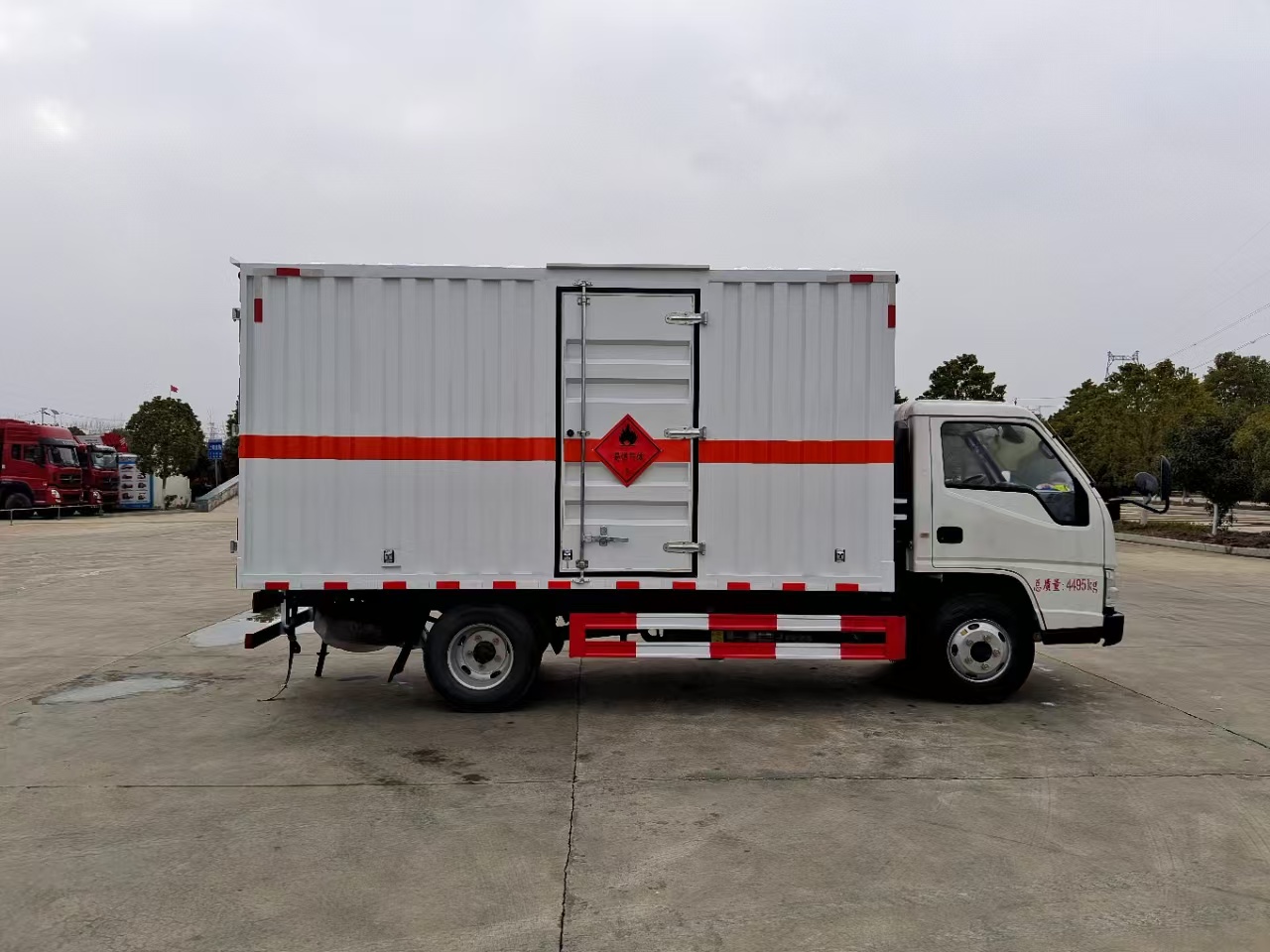 | 貨箱配置 | 廂體為雙層金屬骨架結(jié)構(gòu),外板采用冷軋鋼板,中間填充阻燃泡沫,內(nèi)飾為鋁板。底板為平板上鋪防靜電膠皮。廂內(nèi)兩側(cè)加裝固定貨物臥環(huán),門框帶防盜報警器,頂部帶煙霧報警器,廂體右側(cè)選裝側(cè)門,隨車配2個滅火器,危險標志牌,防火帽,危險品三角頂燈。 | ||