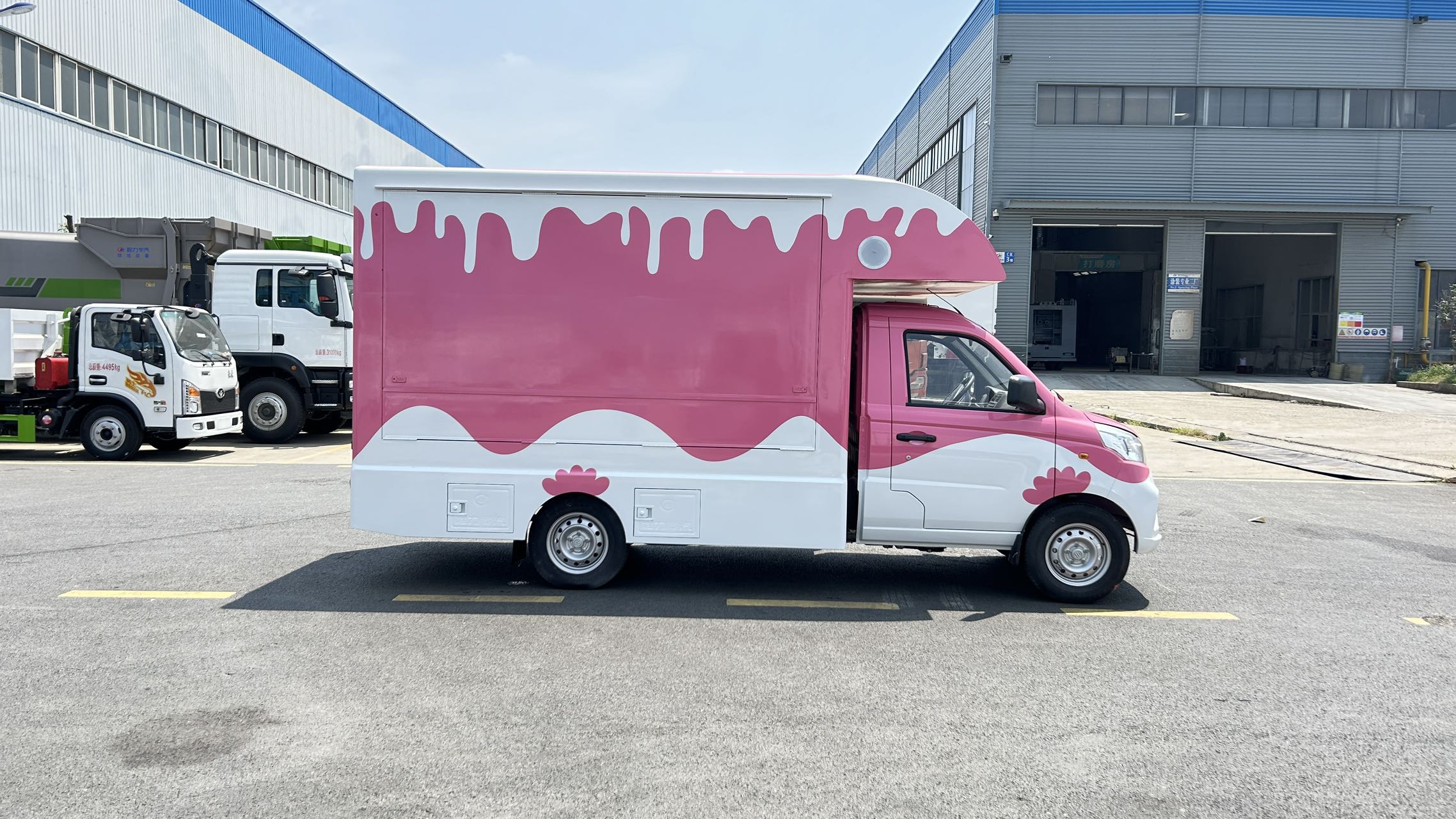 上裝配置 1,箱體材質(zhì):矩形方管骨架,冷板蒙皮結(jié)構(gòu),翻板采用內(nèi)外彩鋼板,中間高性能保溫板,側(cè)板整體復(fù)合,輕量化,保溫隔熱。整體車身顏色為白色,可定制車身各種顏色彩條拉花,或各種噴涂樣式,(選裝內(nèi)部不銹鋼飾面板) 2,箱體結(jié)構(gòu): (1)箱體鴨嘴額頭設(shè)計(jì),帶儲(chǔ)物功能。 (2)箱體兩側(cè)上翻板,帶下翻吧臺(tái)。 (3)地板為防滑鋁花紋板,箱體裙邊包圍,帶檢修艙門,工具柜。
